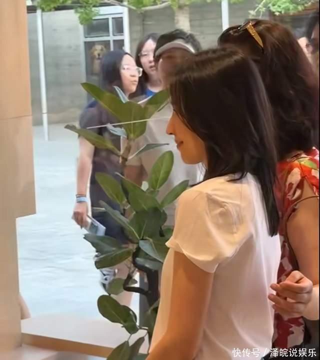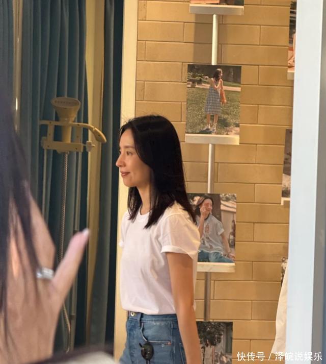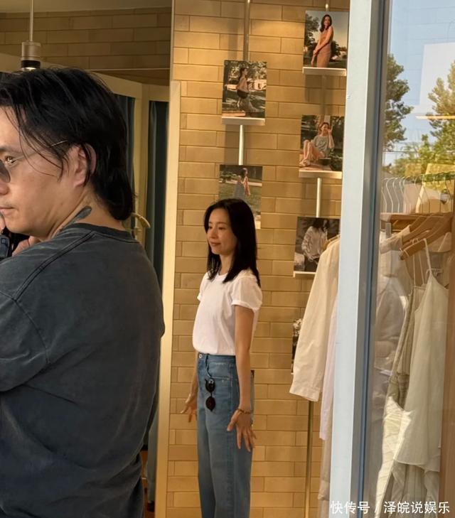 董洁身着白色T恤搭配牛仔裤,头发磨蹭披垂着,在店内线路其事的看胪列,稽察每件穿戴的细节,看着十分的谨慎。
